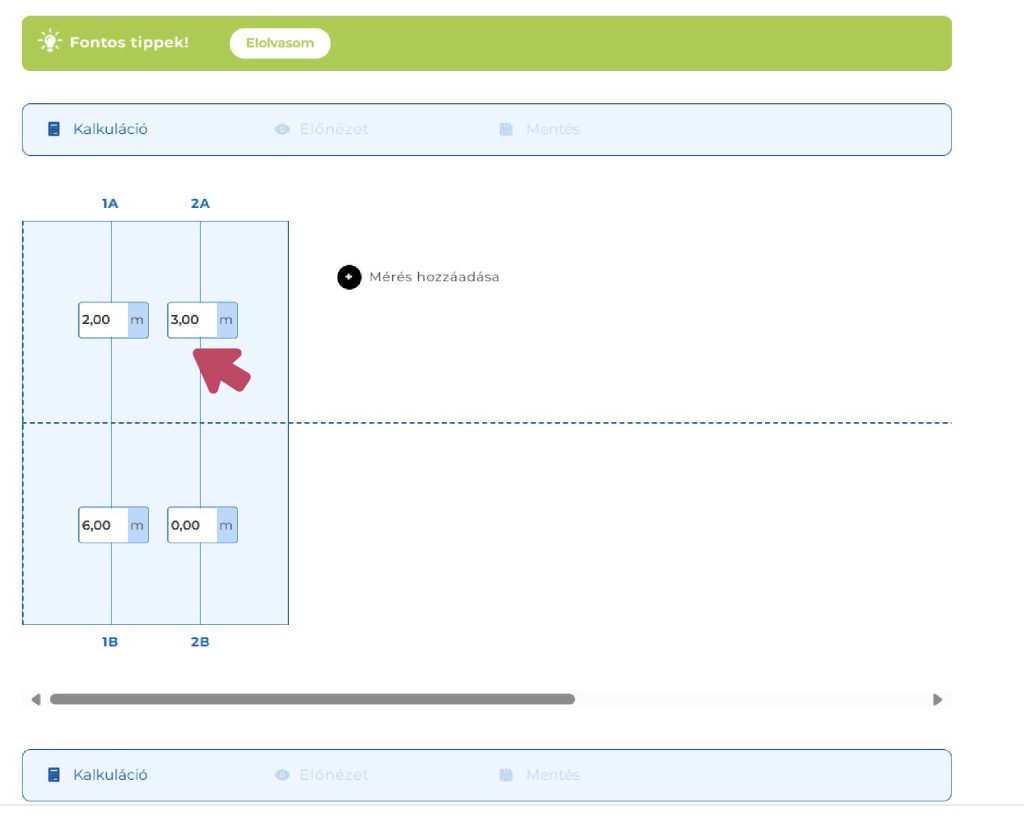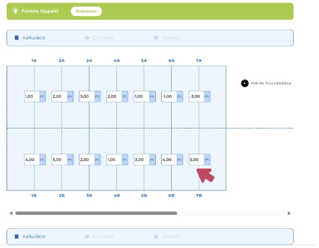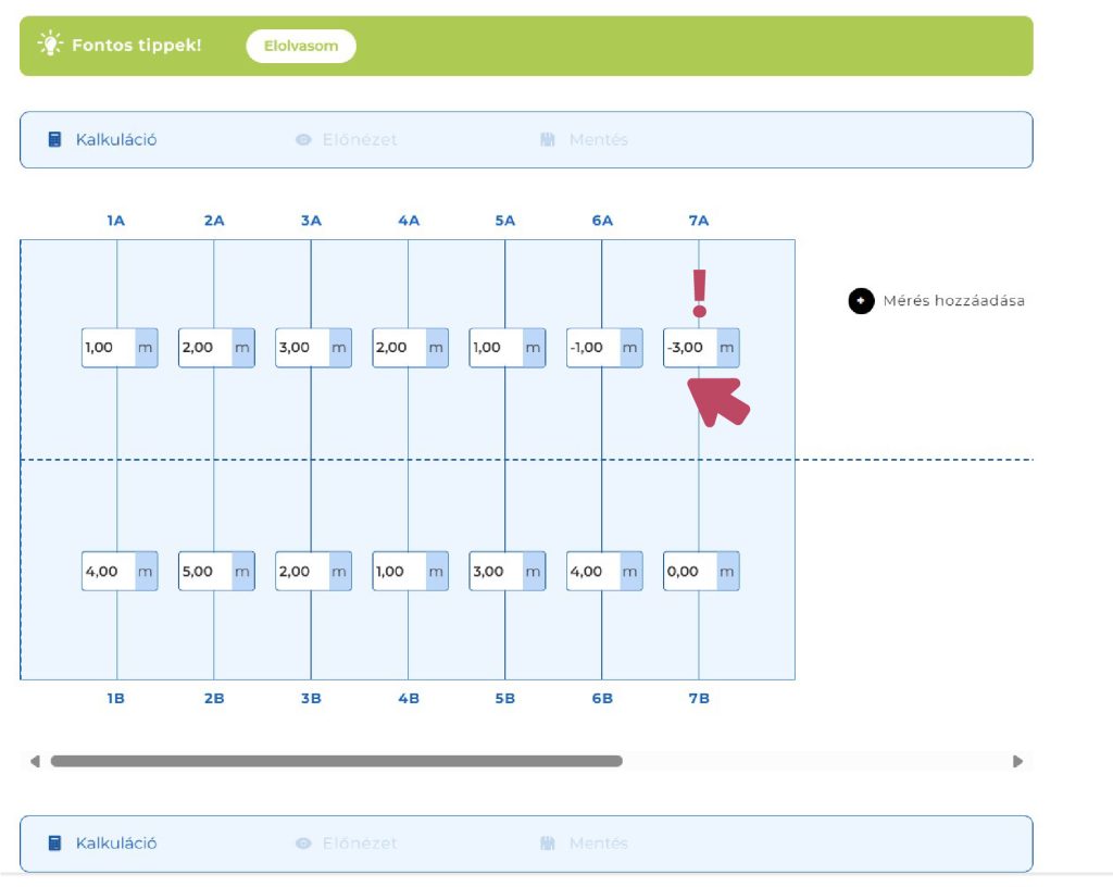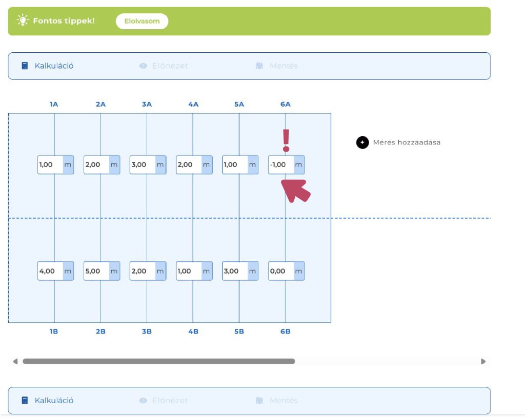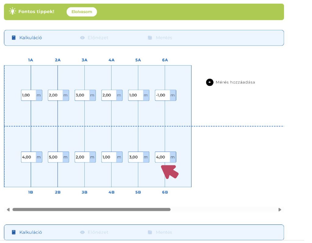 Ha negatív értéket írsz be az egyik mérésbe, akkor a mérés a gerinctől annyival tolódik el az ellentétes irányba. Pl. ha 6A-hoz -1-et írsz be akkor 1 méterrel lejjebb kezdődik a 6B mérése a gerinctől.