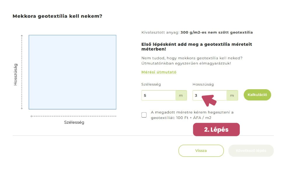 A felméréskor megkapott szélesség és hosszúság fog kelleni ahhoz, hogy a következő lépésekben megtanulhasd, hogy hogyan használd a téglalap formájú geotextília tervezőt.