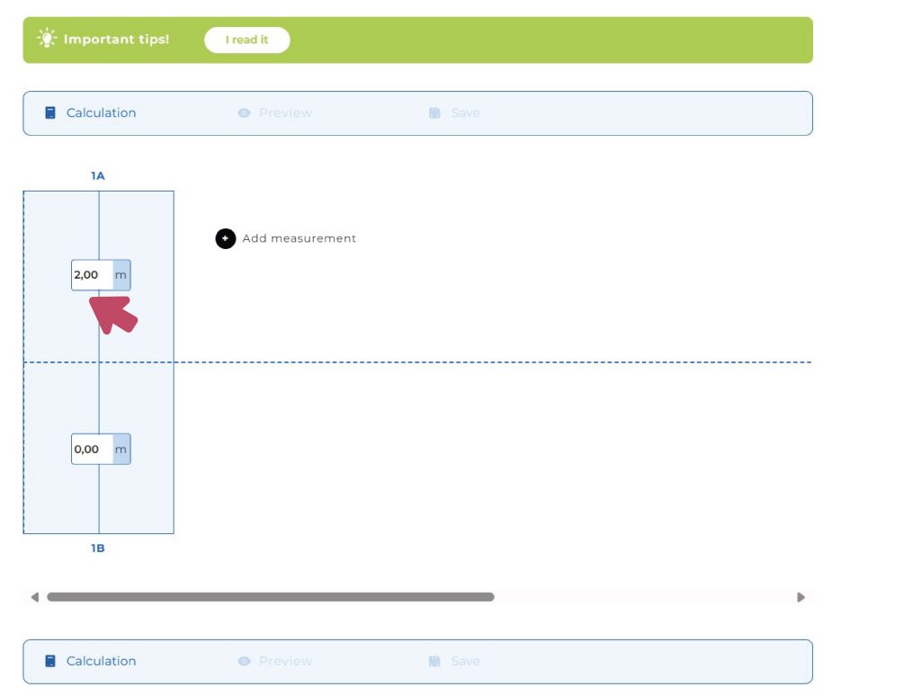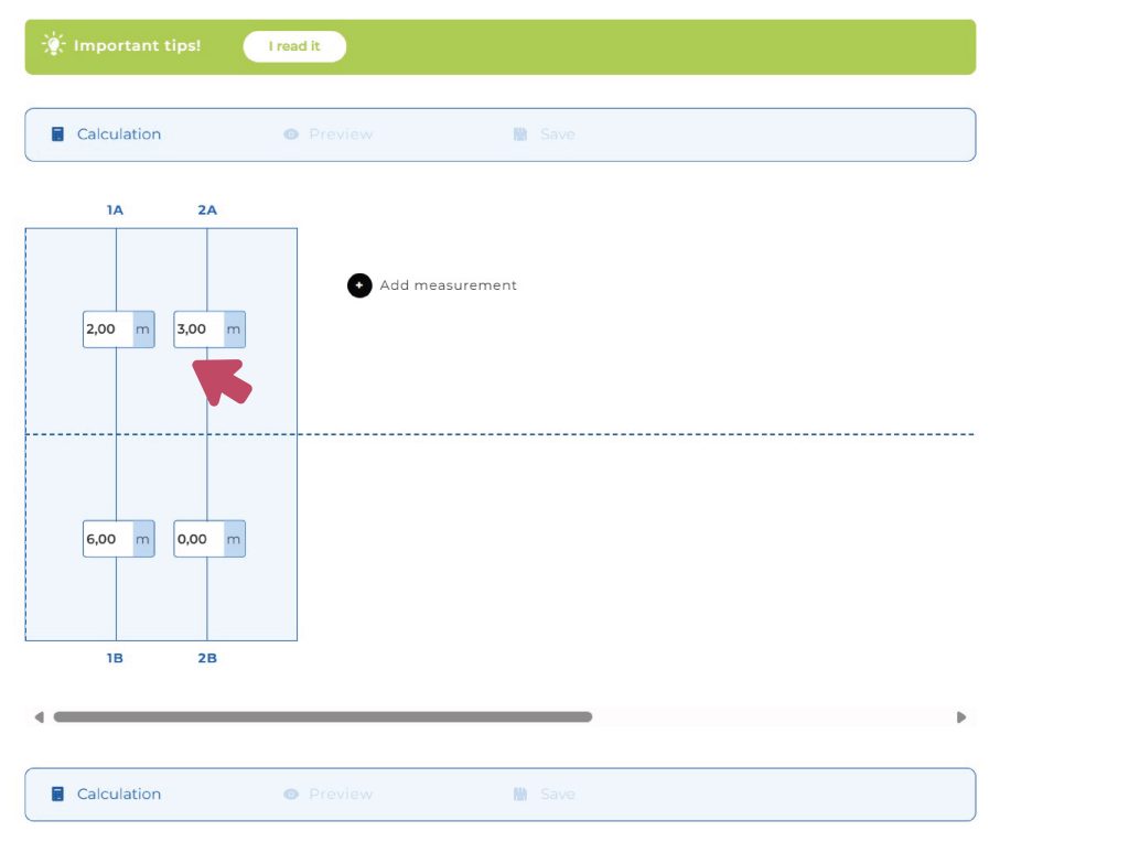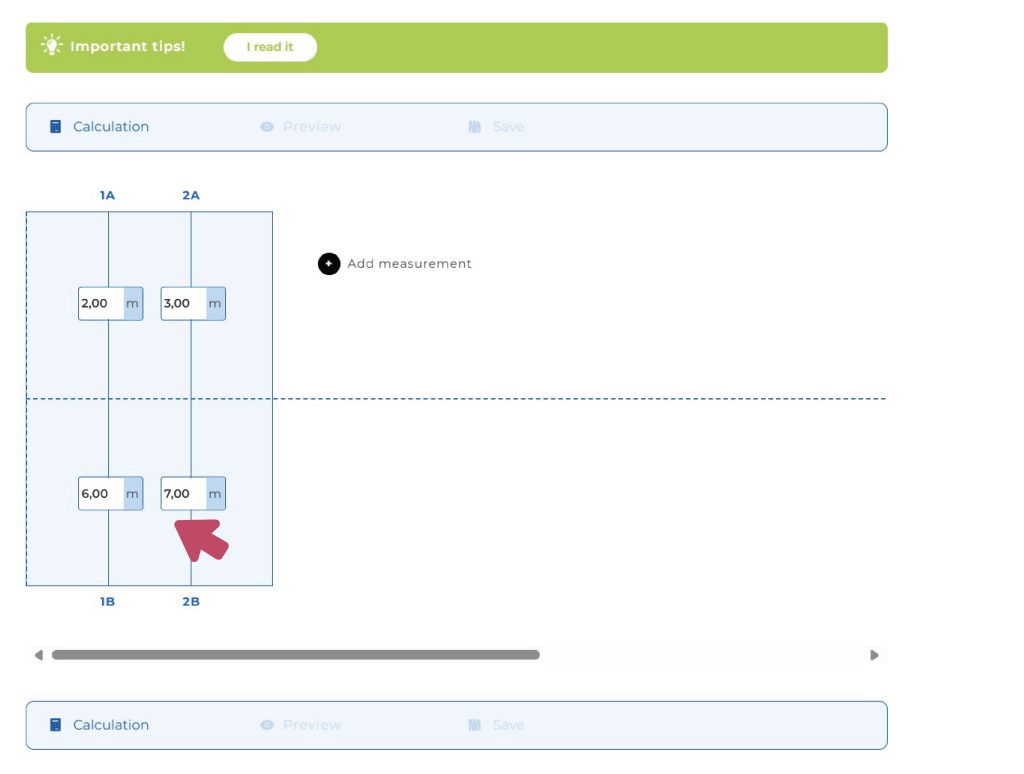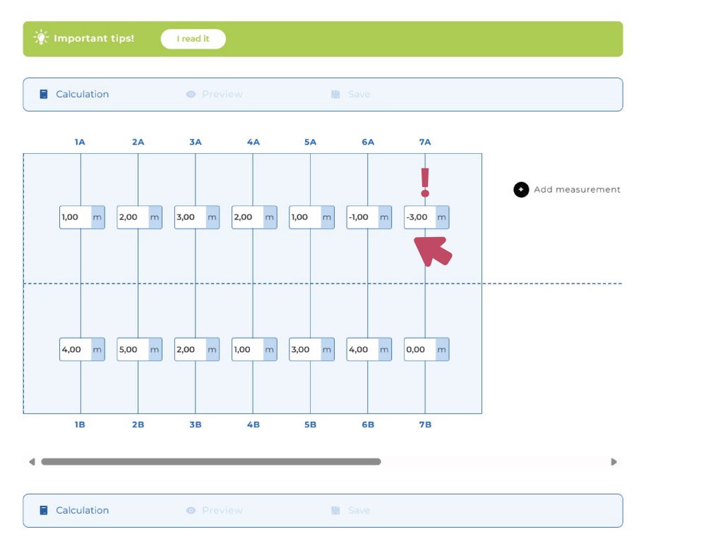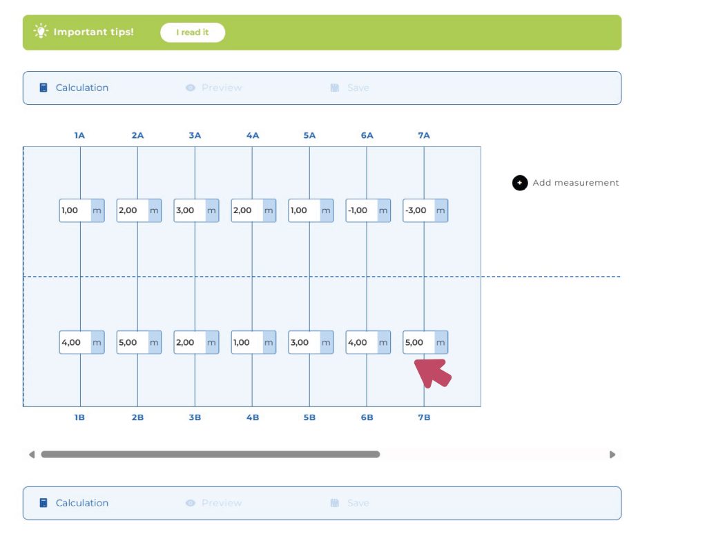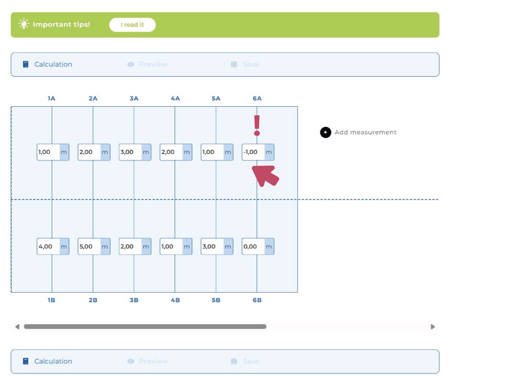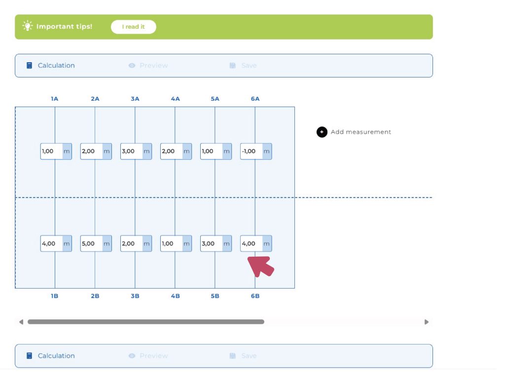 It’s important to know that the number pairs you enter don’t determine the length of each strip, because the calculator/designer will calculate that based on the upper and lower values! In fact, during the survey, the number pairs represent the measurements taken along the welding joints.