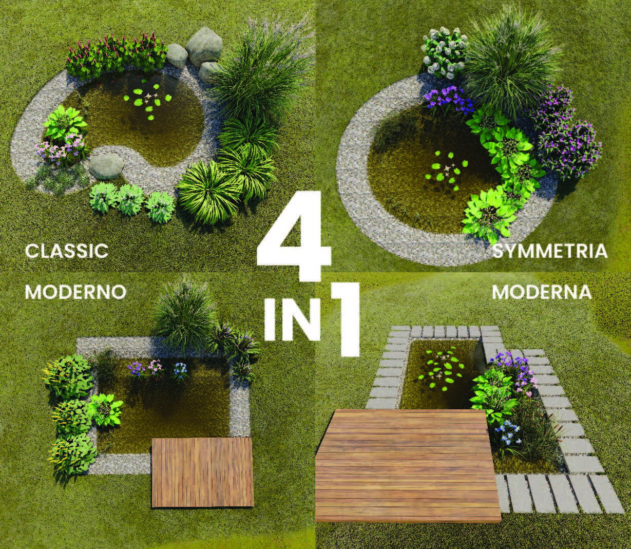 Bármelyik méret is választod, 4 féle dizájn tudsz megépíteni, Classic, Symmetria, Moderna és Modernó. A Te tavad, a Te stílusod!